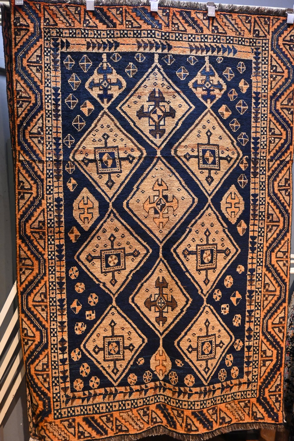 A TRIBAL PERSIAN LURI RUG. 100% WOOL & FOUNDATION. NATURAL DYES. VINTAGE PILE. HAND-KNOTTED TRIBAL WEAVE WITH A DESIGN OF ALL OVER DIAMOND ELONGATED MEDALLIONS IN CAMEL ON A DEEP BLUE BACKGROUND WITH TRIBAL ROSETTES. SIZE: 195 X 130 CM ORIGIN: PERSIA - RRP: $1,900 DOCUMENTATION OF AUTHENTICITY INCLUDED.