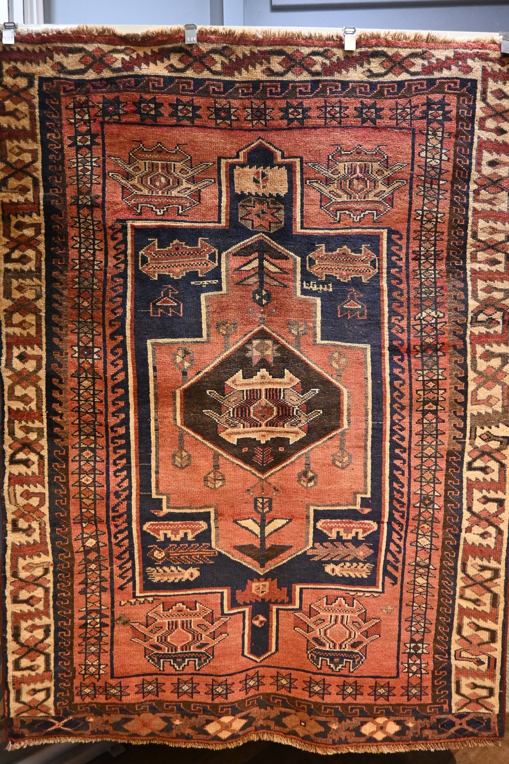 A SOLID PERSIAN TRIBAL KOHI RUG, 100% WOOL PILE. NATURAL DYES. HAND-KNOTTED TRIBAL WEAVE WITH DESIGN OF BOLD HEXAGONAL MEDALLION ON A RED FIELD OF TRIBAL MOTIFS ON A SECONDARY FIELD OF NAVY BLUE CONTAINING TRIBAL EMBLEMS. BORDER OF STAR AND LATCH HOOK MOTIFS. SIZE: 217 X 160 CM ORIGIN: PERSIA - RRP: $2,400 DOCUMENTATION OF AUTHENTICITY INCLUDED.