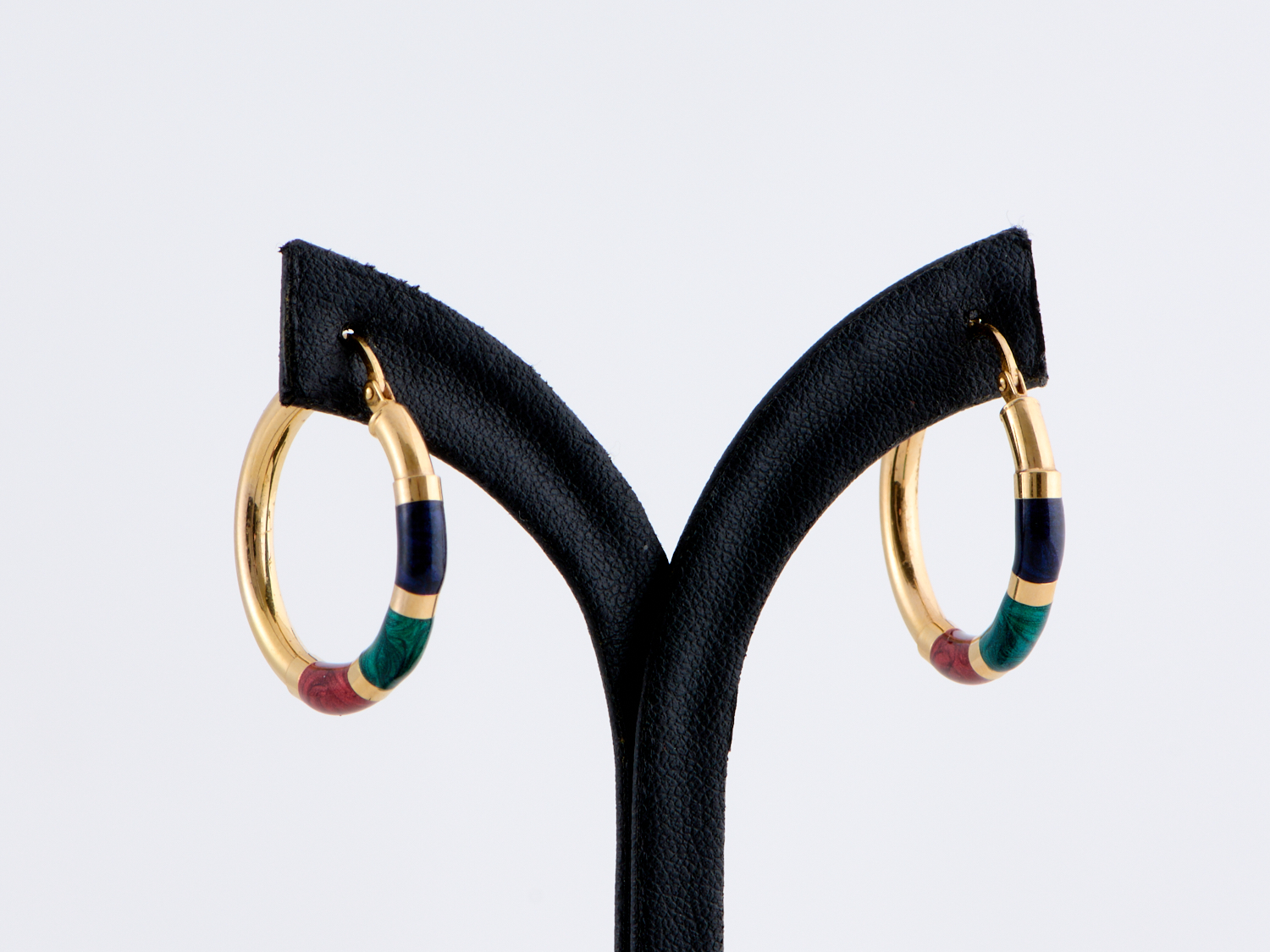 A PAIR OF ITALIAN ENAMEL SET HOOP EARRINGS IN 9CT GOLD, TO POST AND LEVER BACK FITTINGS, 2.23GMS
