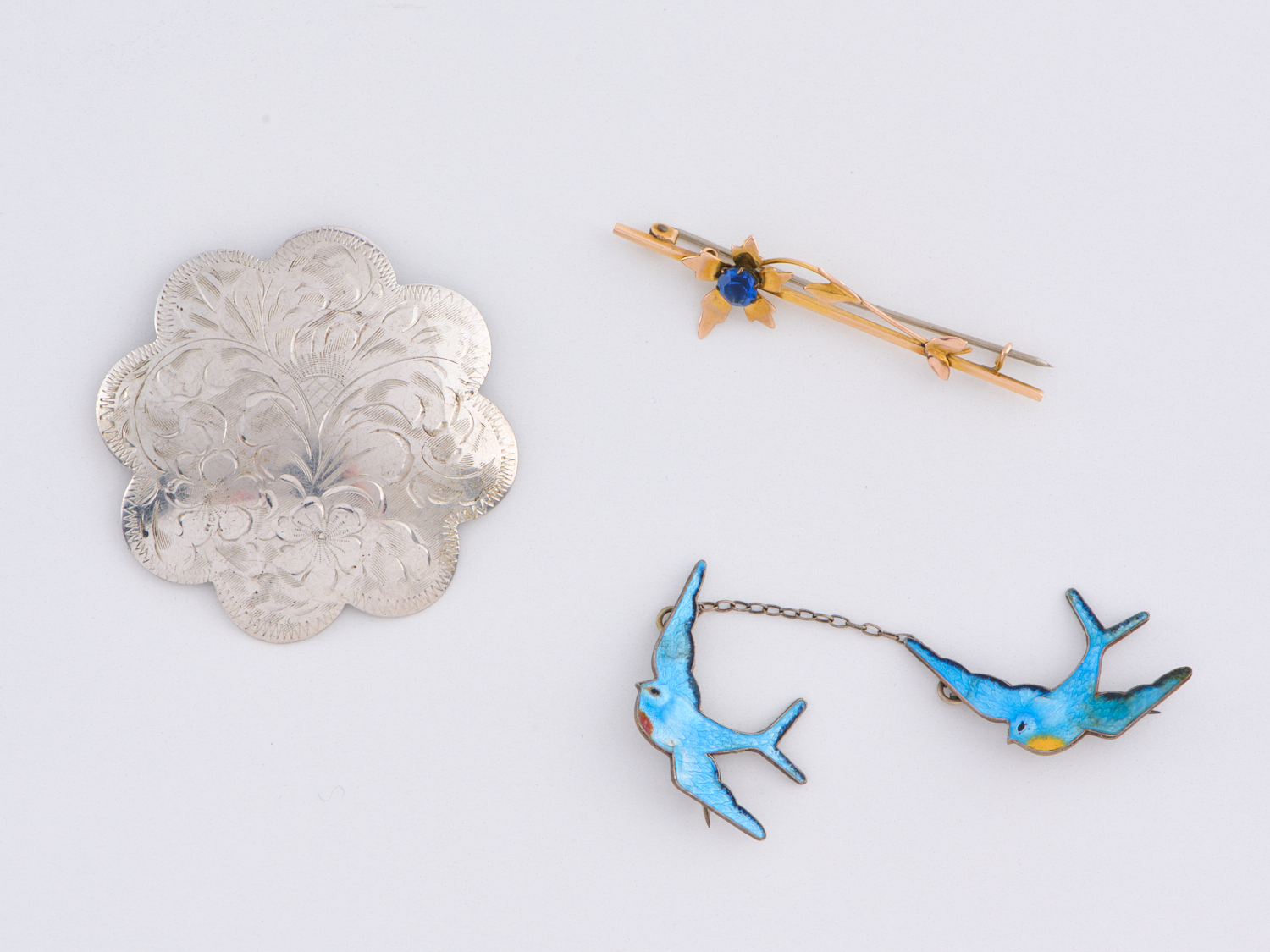 A COLLECTION OF VINTAGE AND ANTIQUE JEWELLERY INCLUDING A SILVER BROOCH (DIAMETER 50MM), A ENAMELLED BIRD COLLAR PIN AND A PASTE SET BROOCH IN 9CT GOLD