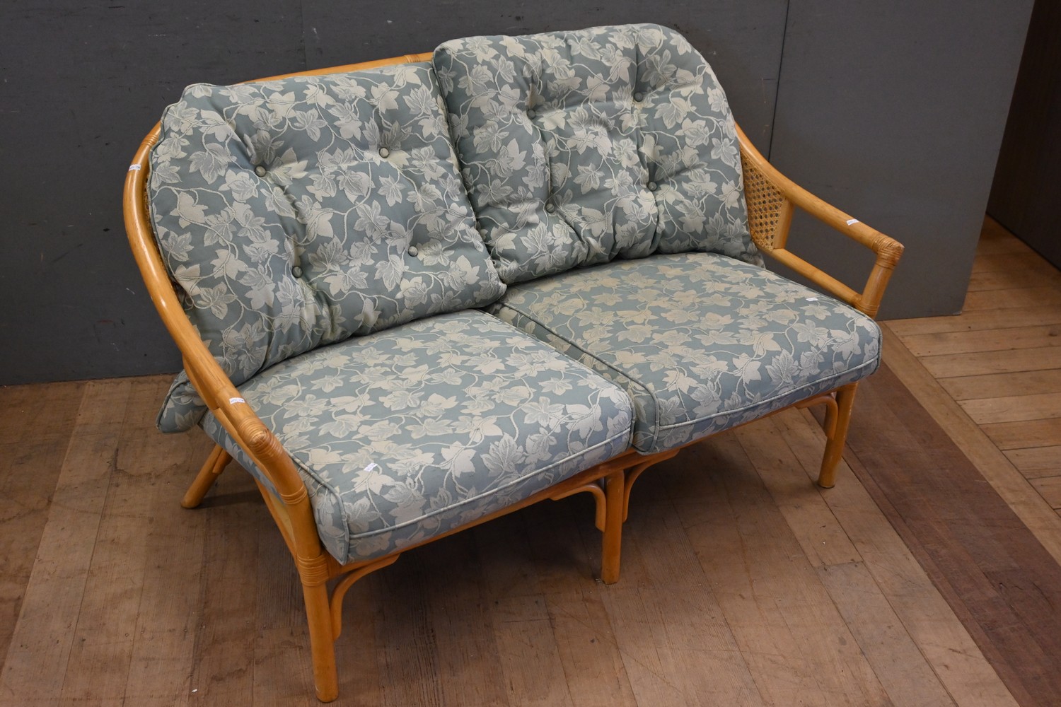 A CANE AND WOVEN RATTAN TWO SEAT LOUNGE (A/F) (84H X 132W X 87D CM) (LEONARD JOEL DELIVERY SIZE: X-LARGE)