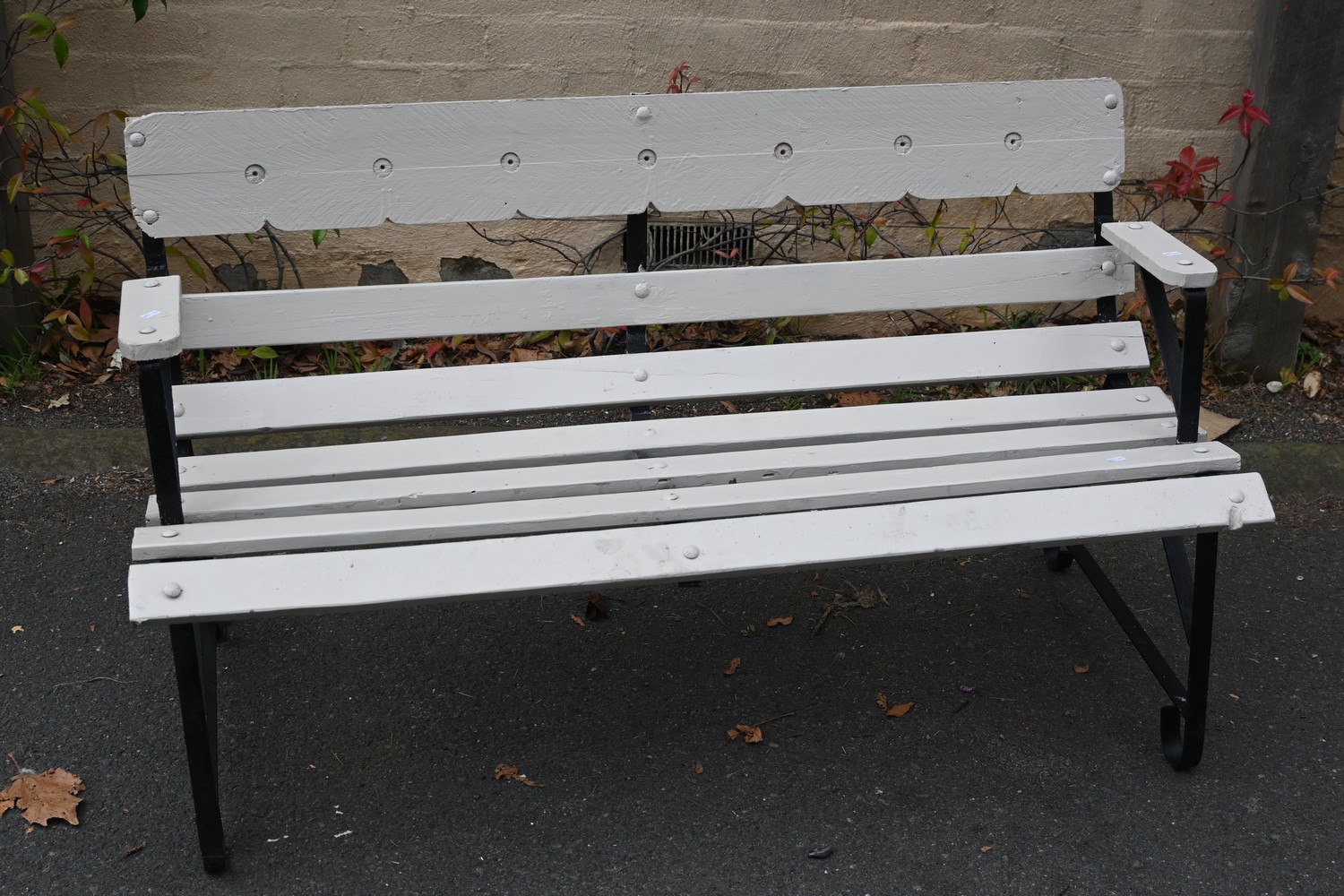 A VINTAGE WROUGHT IRON BASED WHITE PAINTED SLATTED GARDEN BENCH (A/F) (75H X 128W X 61D CM) (LEONARD JOEL DELIVERY SIZE: X-LARGE)