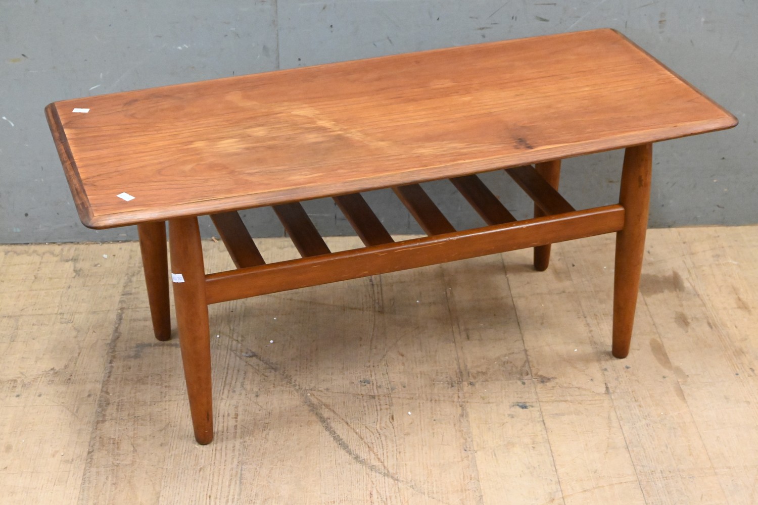 A RETRO AUSTRALIAN MADE SOLID TEAK RECTANGULAR COFFEE TABLE WITH LOWER MAGAZINE RACK (A/F) (41H X 92W X 42D CM) (LEONARD JOEL DELIVERY SIZE: LARGE)