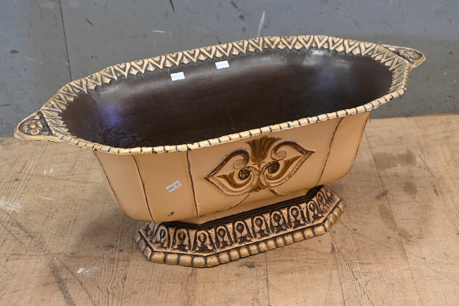 A 19TH CENTURY FRENCH CAST IRON PLANTER POT WITH FLORAL DECORATION TO SIDE AND BASE (26H X 68W X 35D CM) (LEONARD JOEL DELIVERY SIZE: LARGE)