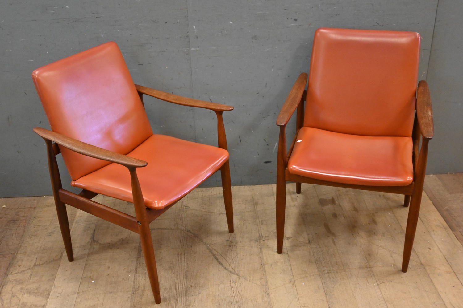 A PAIR OF AUSTRALIAN MADE PARKER SOLID TEAK AND ORIGINAL VINYL SEAT COVER ARMCHAIRS (A/F) (83H X 58W X 59D CM) (LEONARD JOEL DELIVERY SIZE: LARGE)