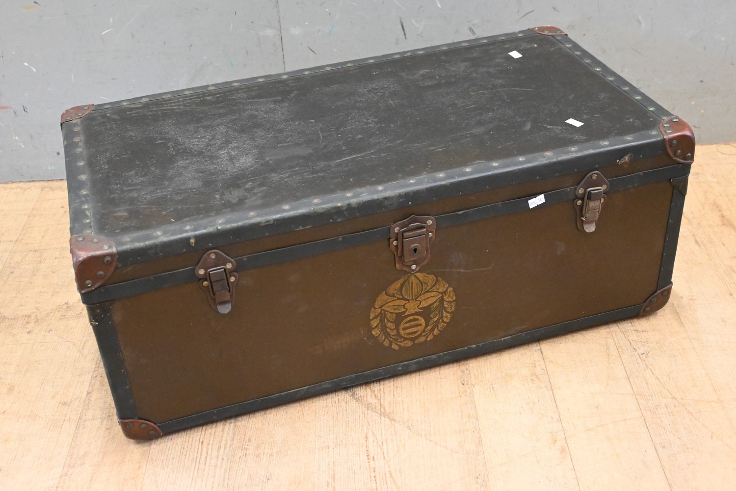 A LEATHERETTE AND METAL BOUND TRAVELLING TRUNK WITH ORIGINAL PAPER LINING (A/F) (32H X 79W X 43D CM) (LEONARD JOEL DELIVERY SIZE: LARGE)