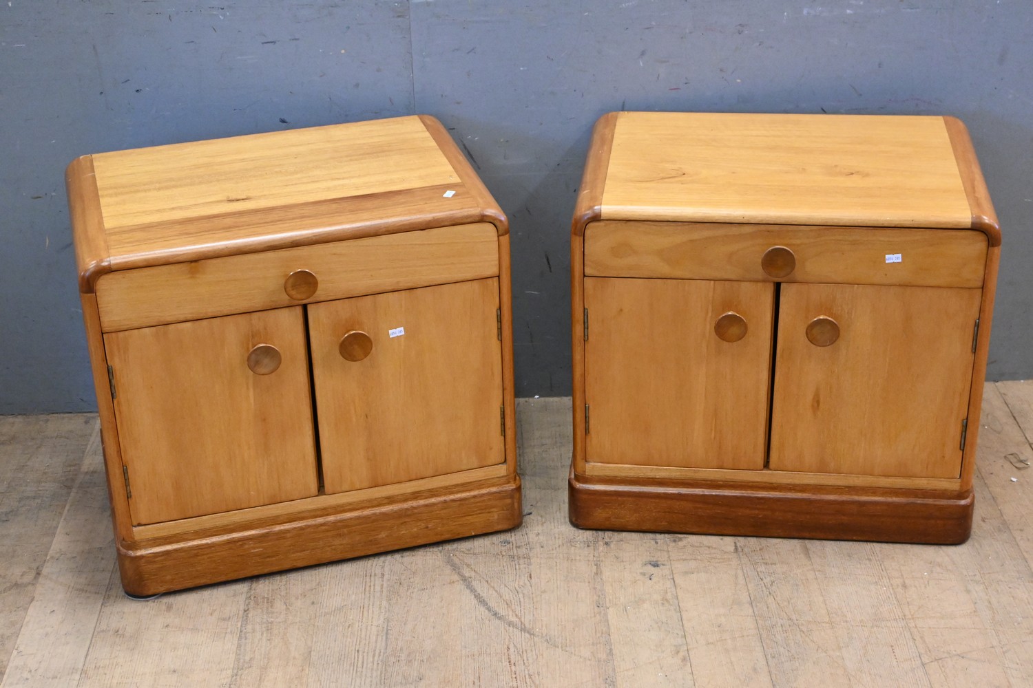A PAIR OF 1950S AUSTRALIAN MADE MYER HERITAGE TWO DOOR AND SINGLE DRAWER BEDSIDE CABINETS (A/F) (56H X 62W X 41D CM) (LEONARD JOEL DELIVERY SIZE: LARGE)