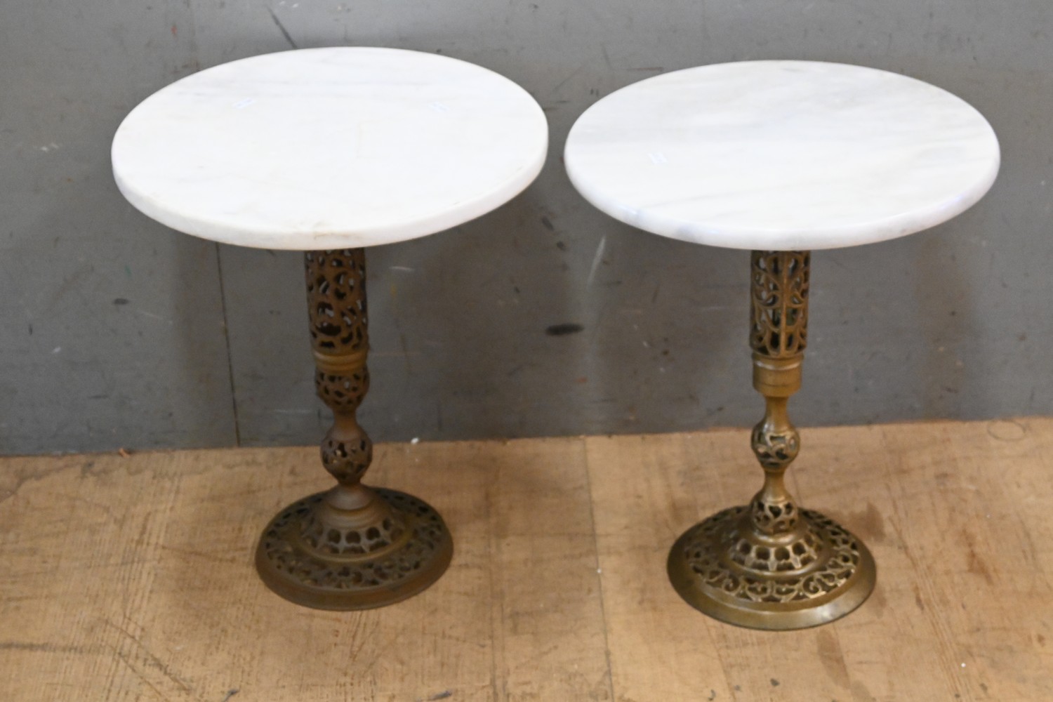 TWO CIRCULAR MARBLE TOPPED AND PIERCED BRASS BASE SIDE TABLES (47H X 39D CM) (LEONARD JOEL DELIVERY SIZE: LARGE)