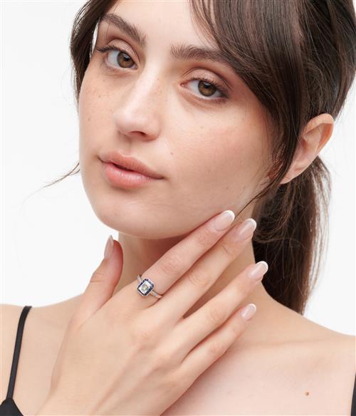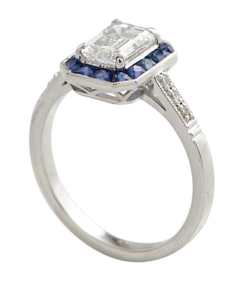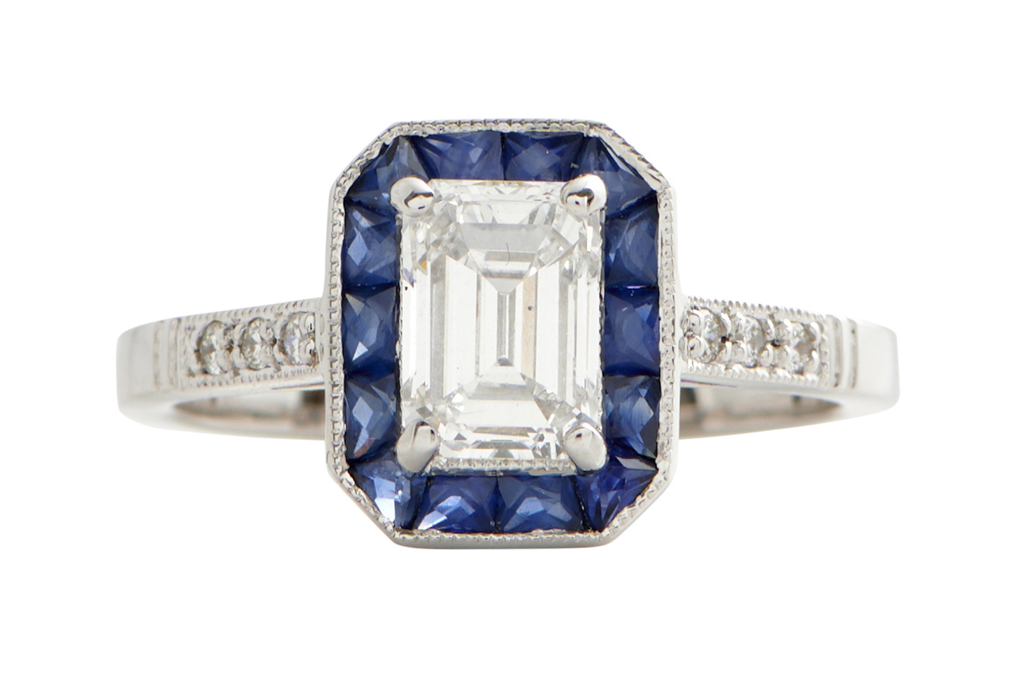 Of cluster design, centring a claw-set emerald-cut diamond weighing 1.30, within a surround of calibre-cut sapphires to diamond-set shoulders, size N. Accompanied by copy of Auscert certificate number 2018L90422 stating the 1.306 carat diamond is E colour, VVS2 clarity.