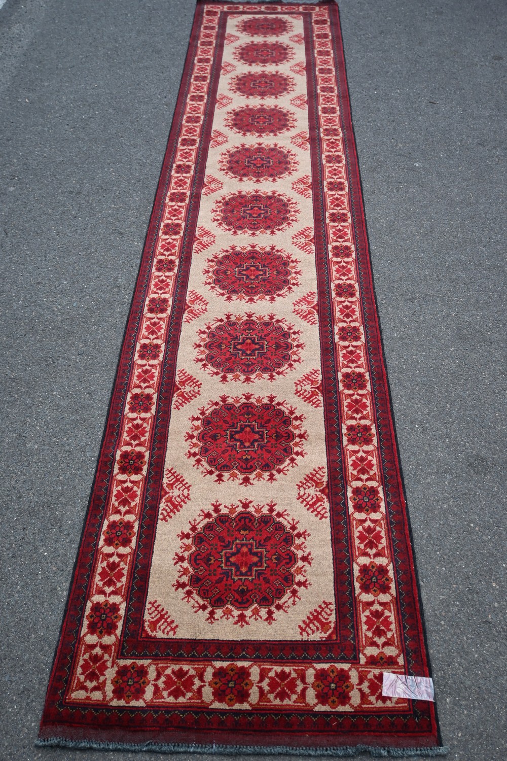 A AFGHAN TRIBAL RUG, 100% WOOL ON WOOL, HEAVY DUTY IN WOOL MOTIF, ALL HAND KNOTTED (395 x 76 CM) (LEONARD JOEL DELIVERY SIZE: LARGE)