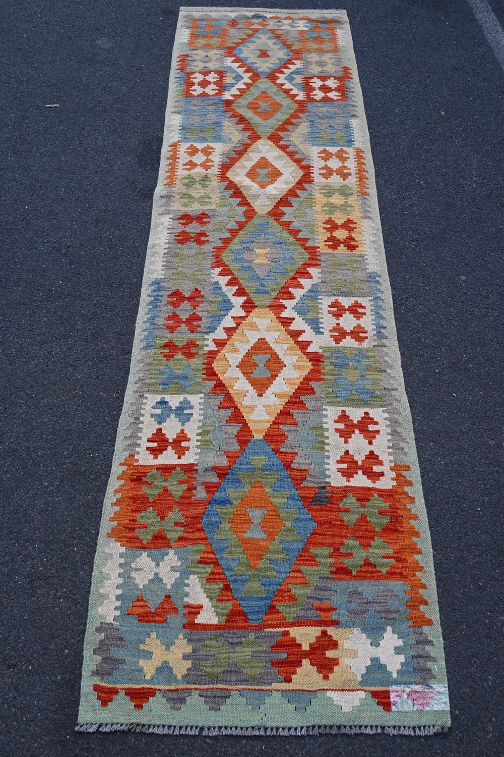 AN AFGHAN CAUCASIAN KILM RUNNER, 100% WOOL ON WOOL, VEGETABLE DYES, REVERSEABLE WITH CAUCASIAN DESIGN (309 X 82 CM) (LEONARD JOEL DELIVERY SIZE: MEDIUM)
