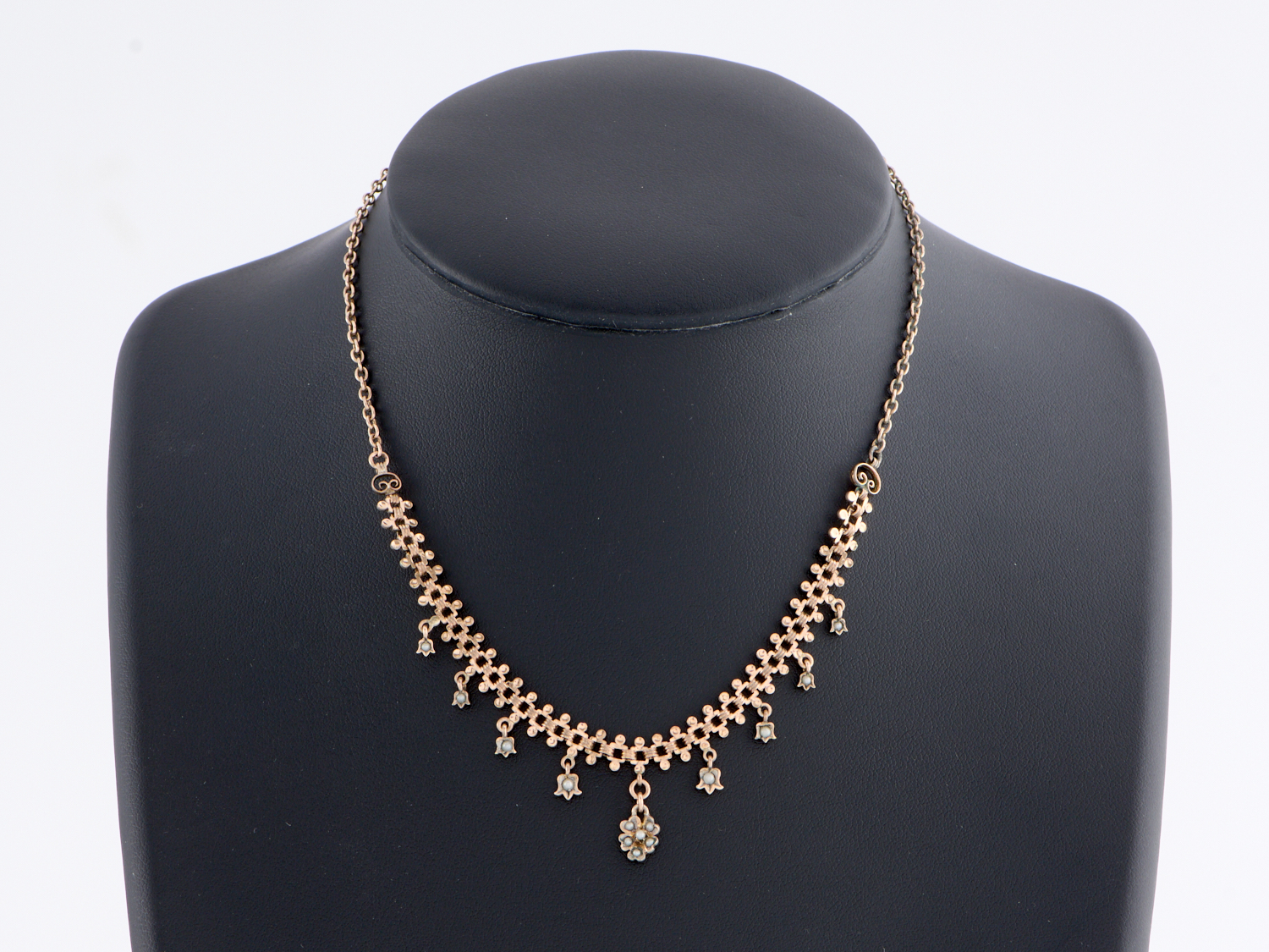 AN ANTIQUE FRINGE STYLED NECKLACE WITH SEED PEARL DETAIL IN GOLD LINED METAL, TO A BARREL CLASP, 380MM