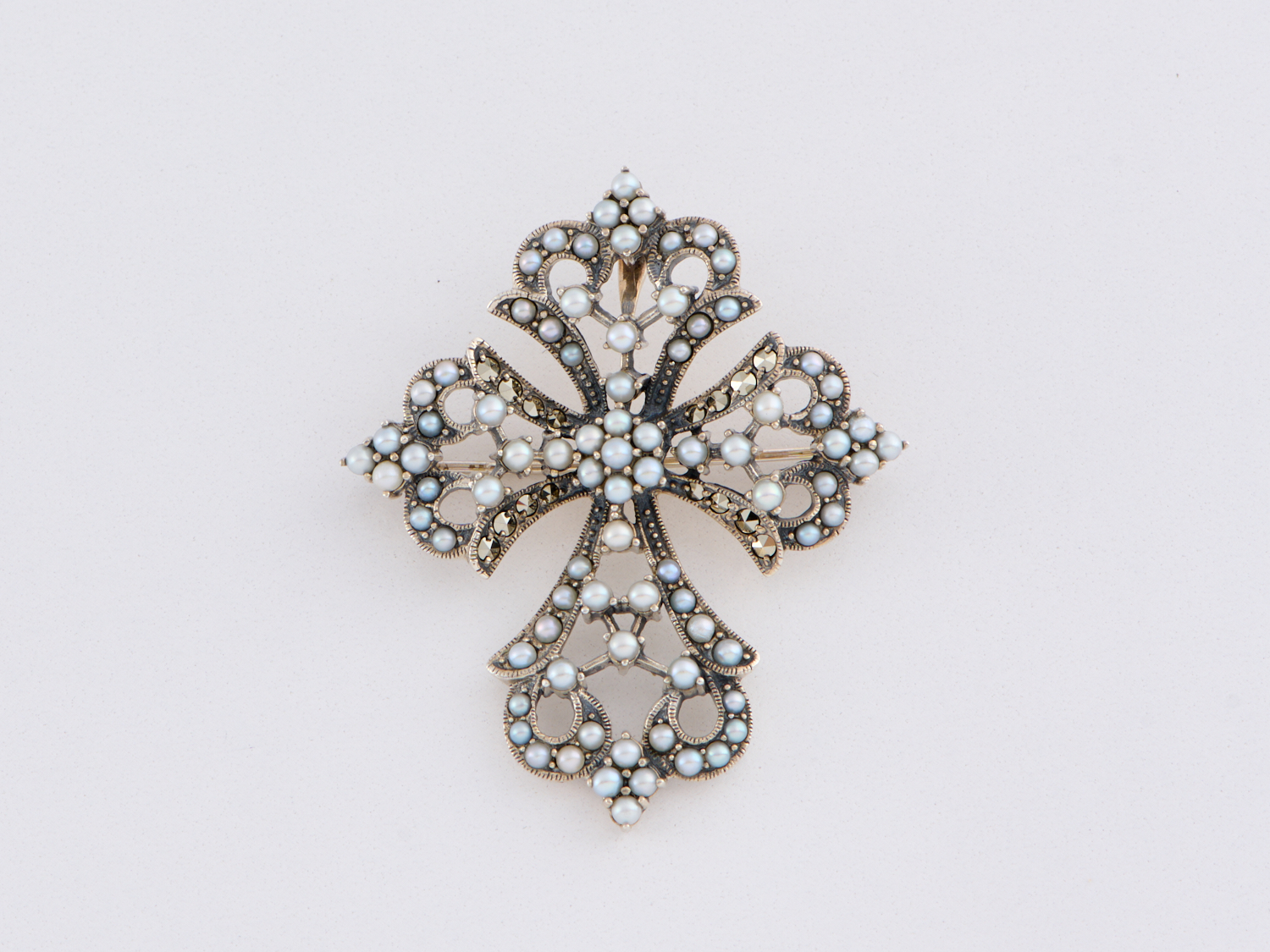 A CRUCIFORM BROOCH/PENDANT IN STERLING SILVER WITH SEED PEARL DETAIL, 48 X 35MM
