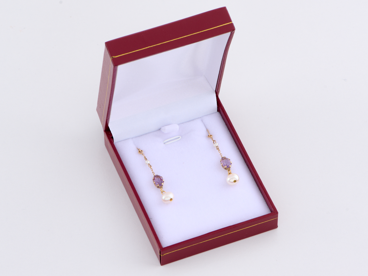 A PAIR OF AMETHYST AND PEARL DROP EARRINGS TO 9CT GOLD SHEPHERDS HOOKS, LENGTH 43MM (BOXED)