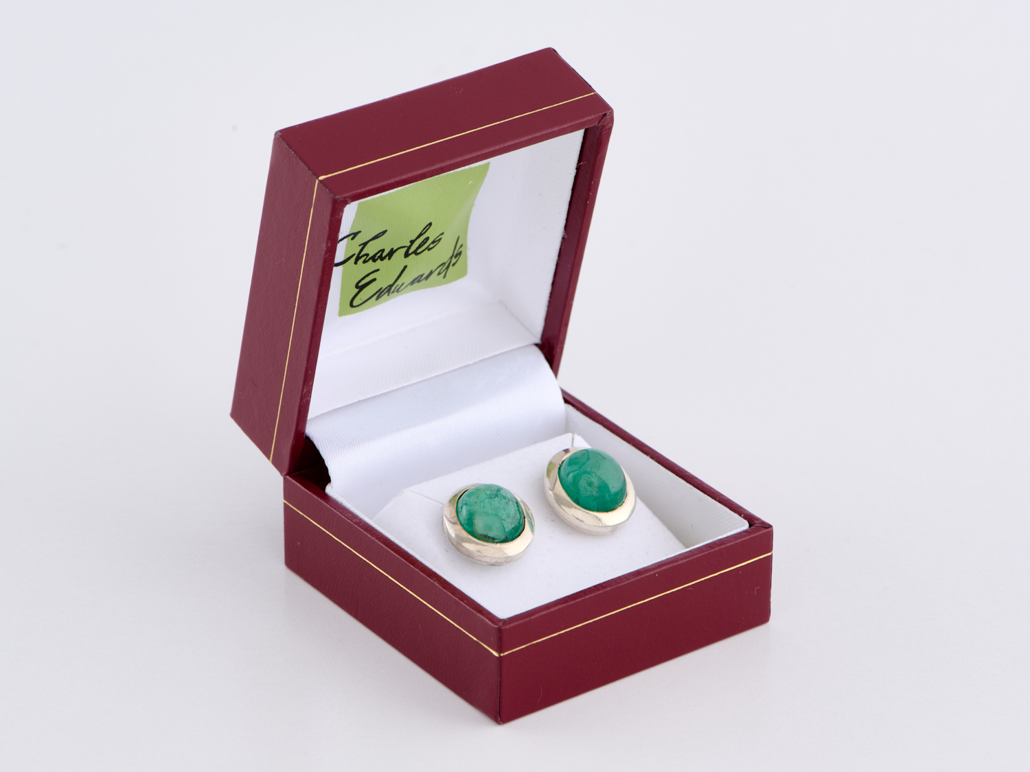 A PAIR OF CABOCHON EMERALD STUDS IN STERLING SILVER, TO POST AND BUTTERFLY FITTINGS, BOXED