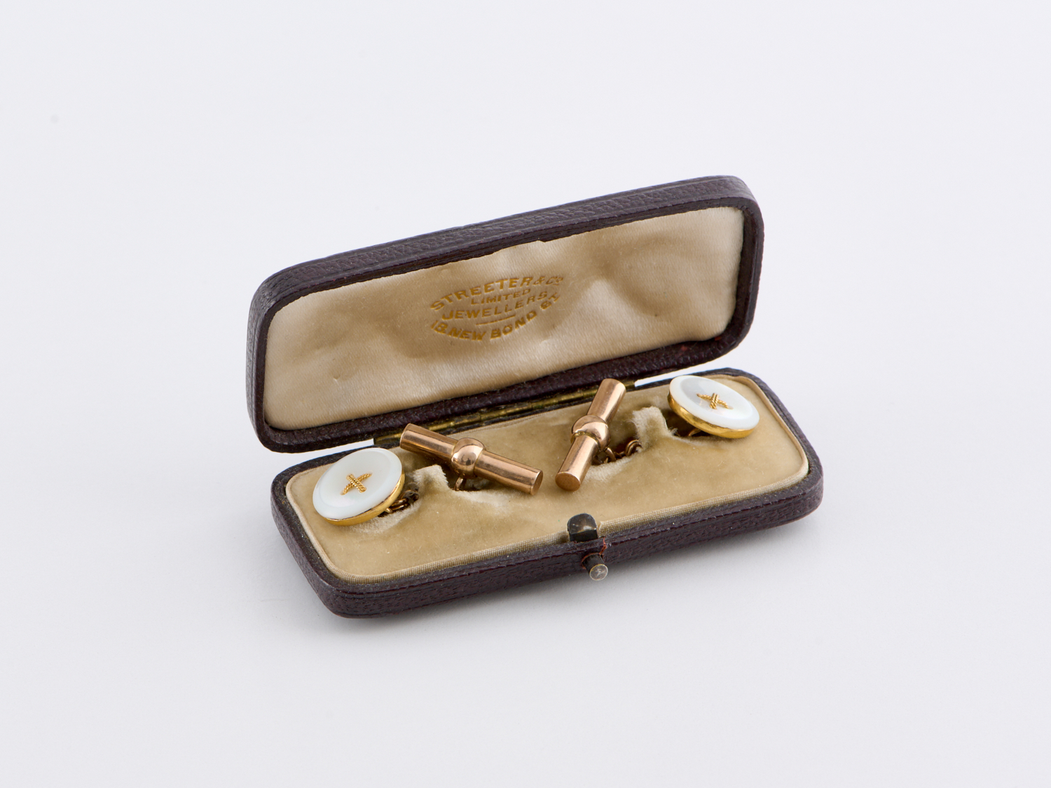 A PAIR OF EDWARDIAN MOTHER OF PEARL SET CUFFLINKS, BOXED, 5.89GMS