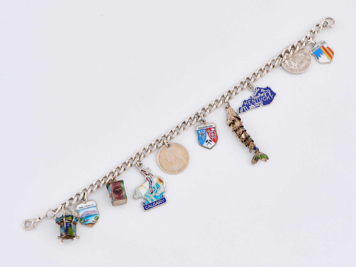 A VINTAGE CHARM BRACELET IN SILVER WITH VARIOUS STERLING SILVER AND ENAMELLED CHAMRS, LENGTH 180MM