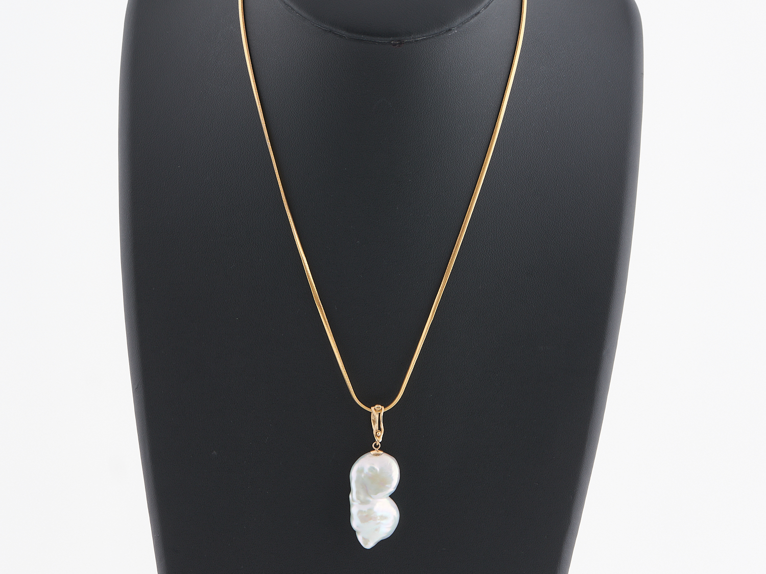 A BAROQUE CULTURED PEARL PENDANT TO A BALE AND SNAKE LINK CHAIN IN 9CT GOLD, THE WEIGHING 6.80GMS