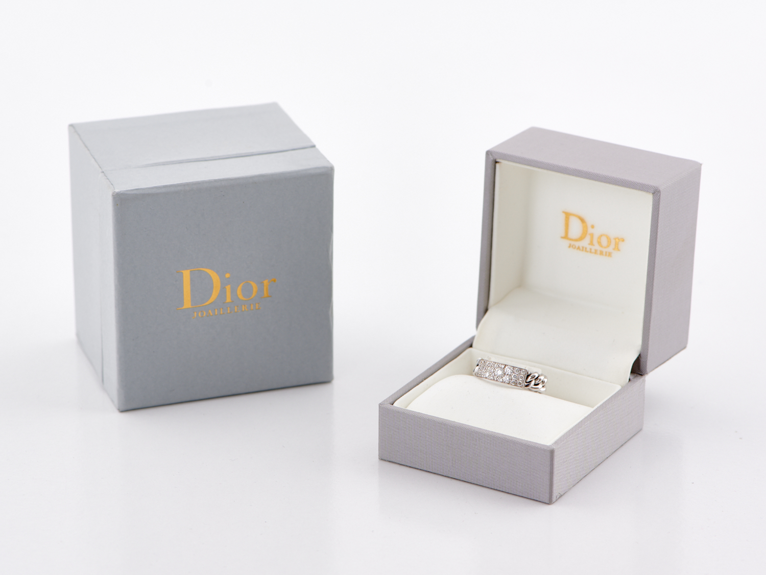 CHRISTIAN DIOR, 18CT GOLD RING - Styled in the form of a diamond chain in white gold, ring size j, the diamonds totalling approximately 0.50cts, with box.