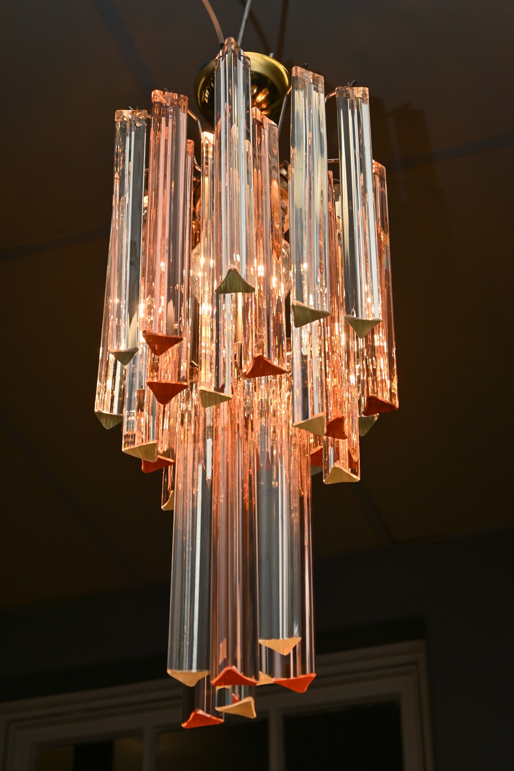 A 1970'S CRYSTAL VENINI TRIEDRI CHANDELIER IN PINK AND CLEAR SHARDS (70H CM) (LEONARD JOEL DELIVERY SIZE: LARGE)