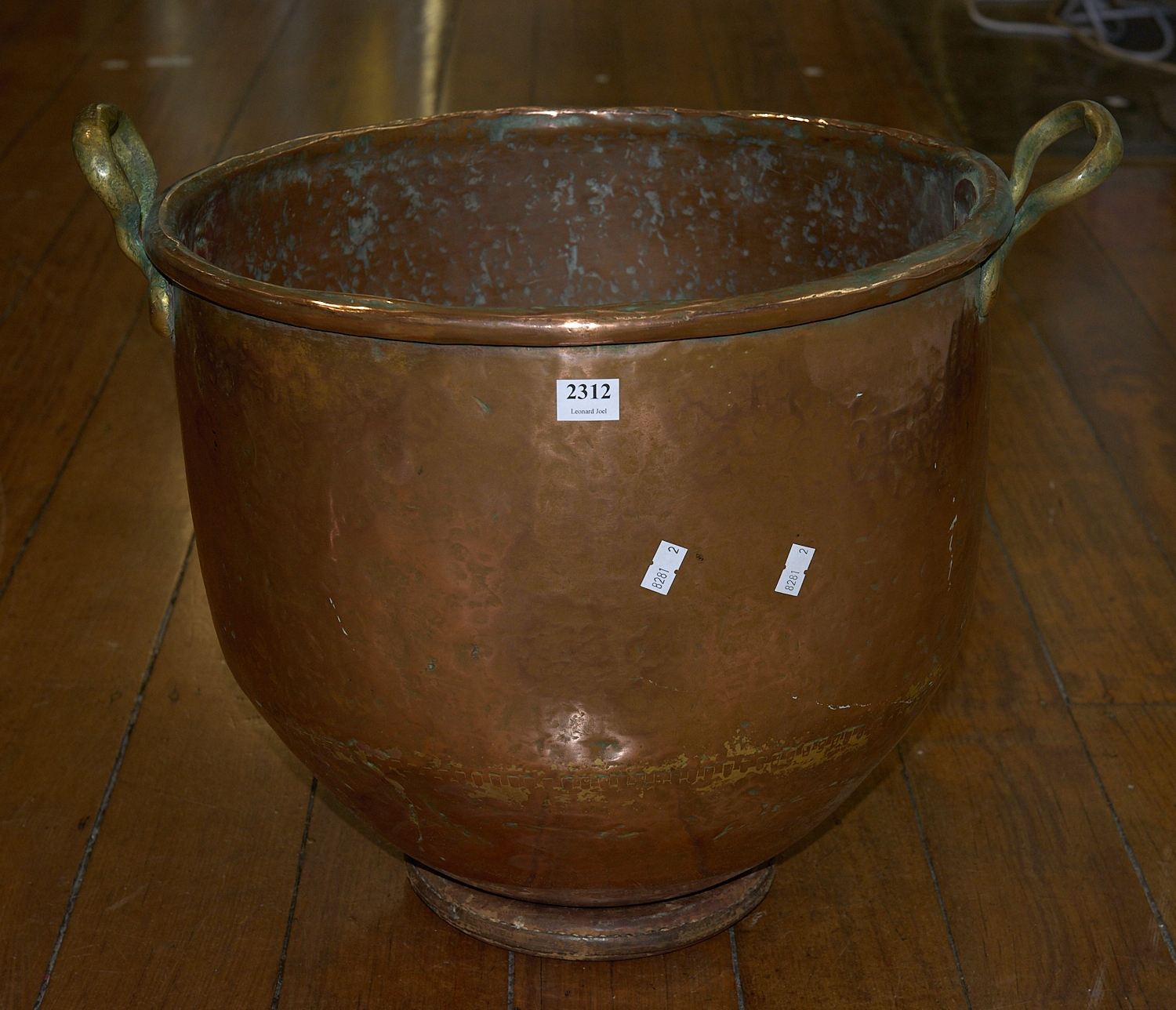 A LARGE COPPER CHOCOLATE POT WITH LEATHER STAND (H42 X D41 CM), LEONARD JOEL LOCAL DELIVERY: MEDIUM