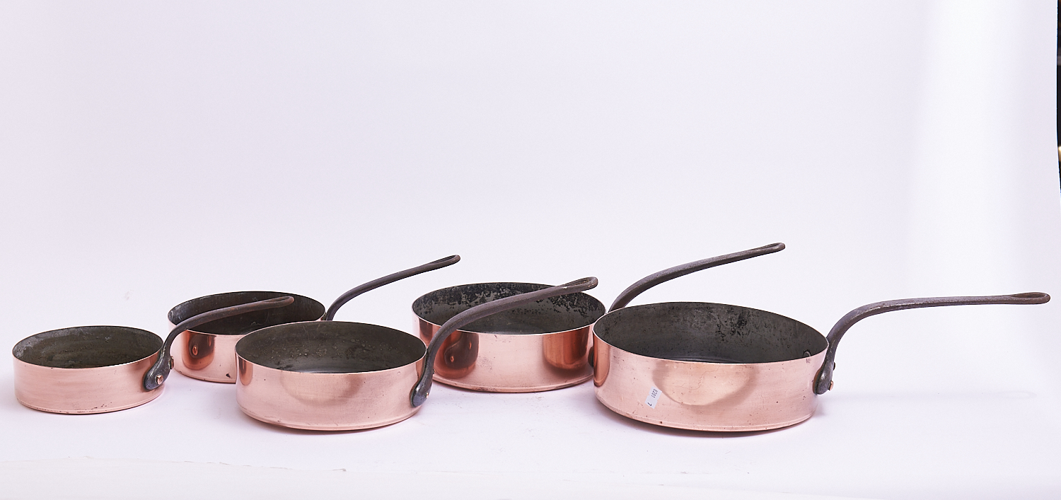 A SET OF FIVE COPPER SAUCEPANS MARKED VILLEDIEU ML FRANCE (LARGEEST D25 CM), LEONARD JOEL LOCAL DELIVERY: MEDIUM