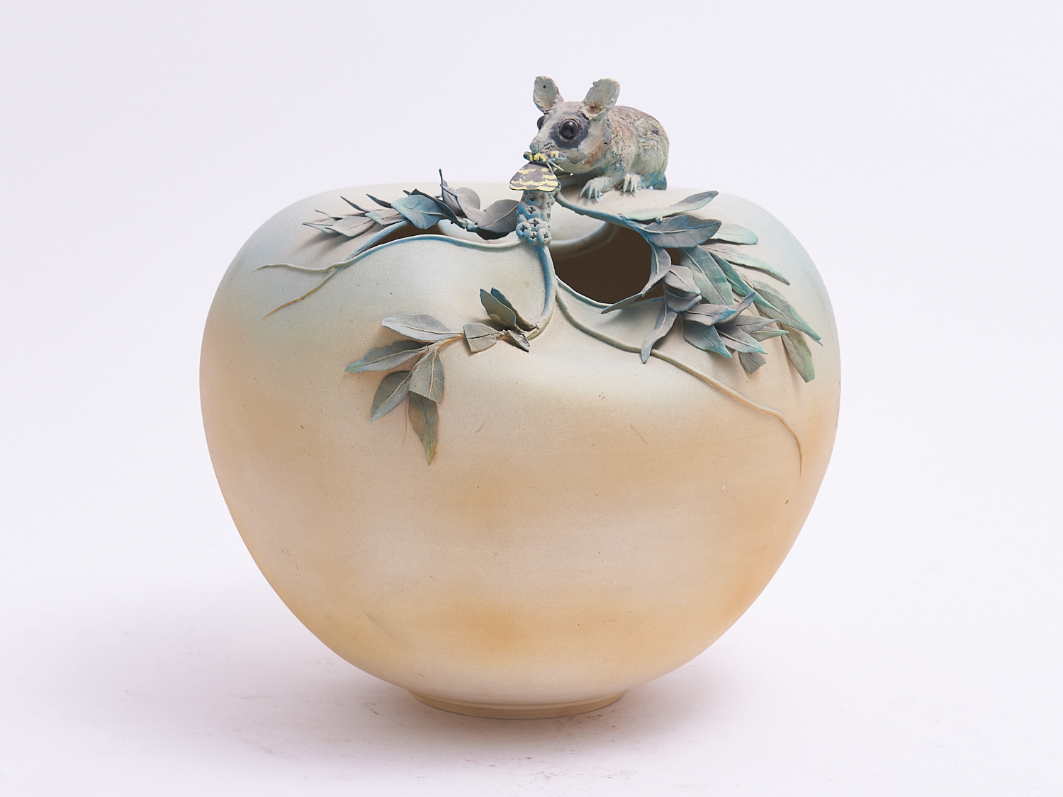 A STUDIO POTTERY VASE WITH APPLIED MOUSE AND LEAF DECORATION (A/F) H.30CM, LEONARD JOEL LOCAL DELIVERY: MEDIUM