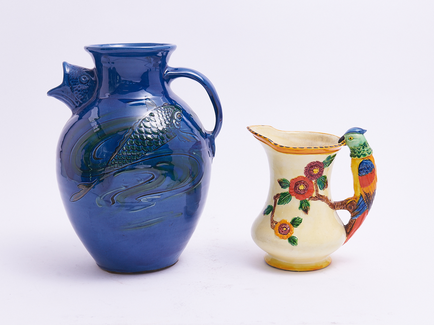 A CERAMIC JUG WITH FISH MOTIF TOGETHER WITH PARROT HANDLE JUG (A/F), LEONARD JOEL LOCAL DELIVERY: MEDIUM