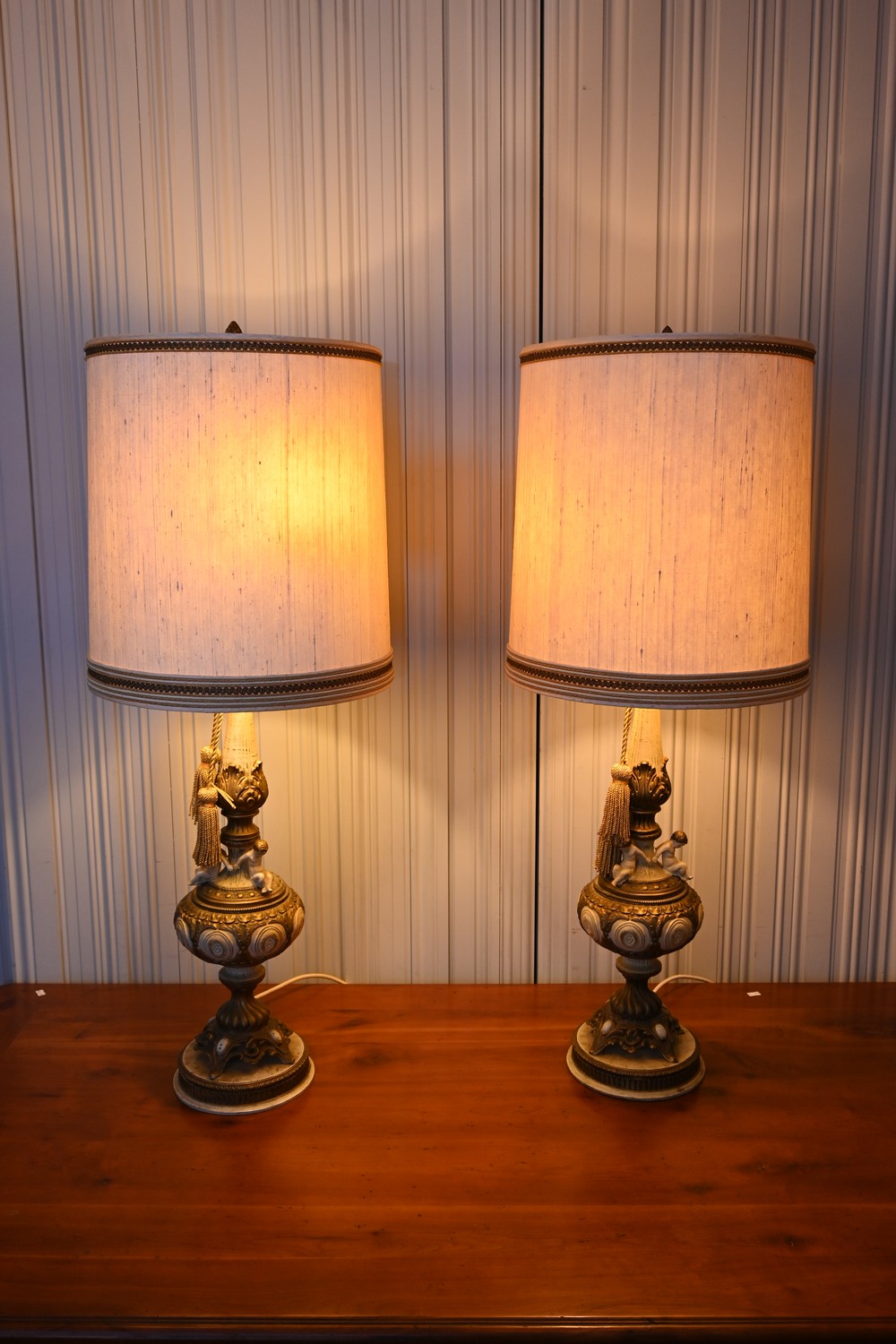 A PAIR OF HIGHLY DECORATIVE CLASSICAL STYLE TABLE LAMPS (A/F) (110H CM) (LEONARD JOEL DELIVERY SIZE: LARGE)