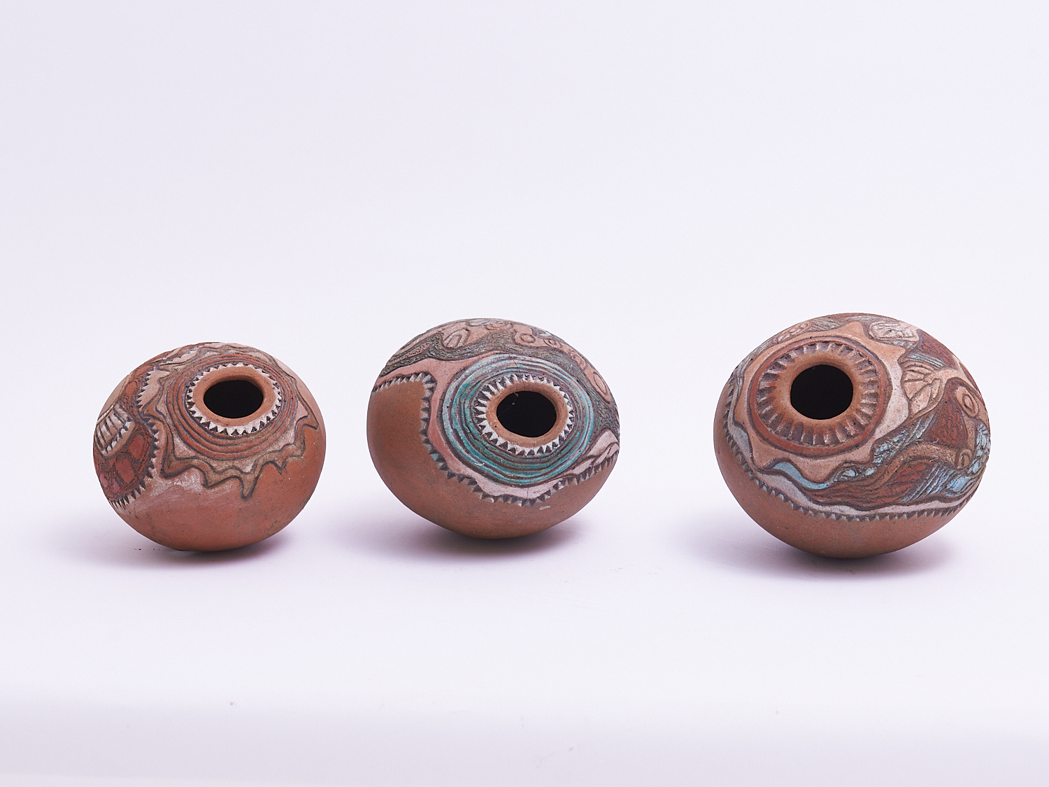 TRIO OF TERRACOTTA VASES WITH ABORIGINAL MOTIFS (A/F TO ONE), LEONARD JOEL LOCAL DELIVERY: SMALL