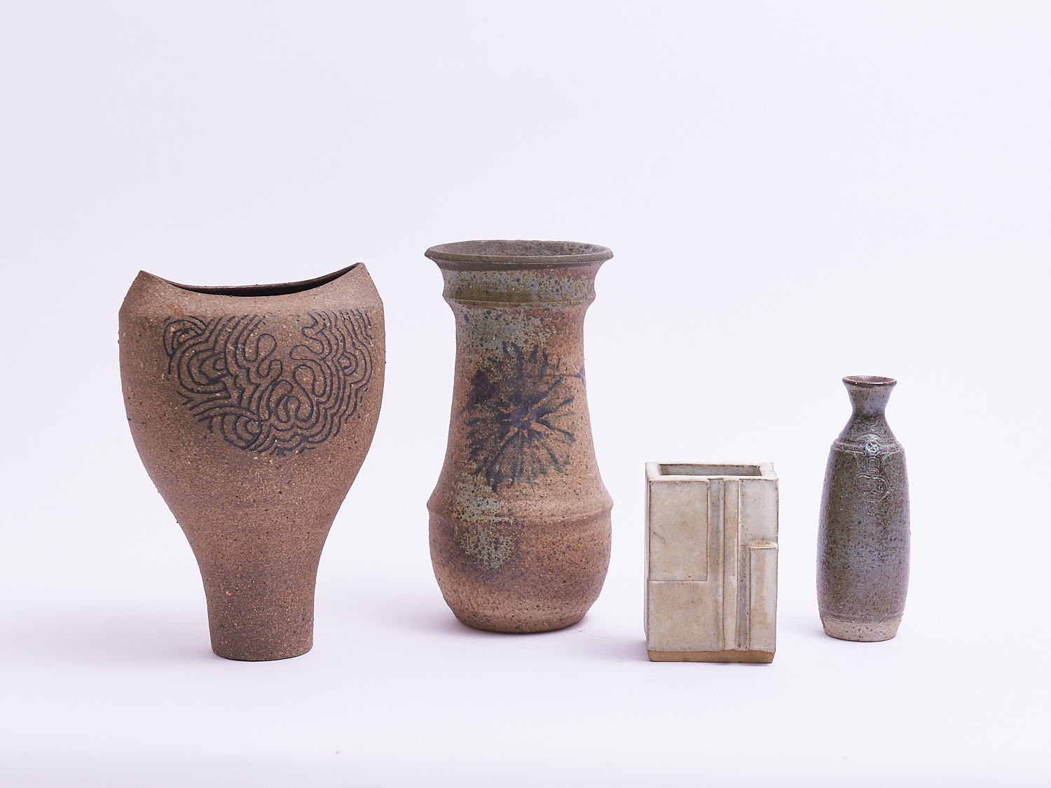 FOUR STUDIO POTTERY VASES INCLUDING BRUTALIST STYLE, LEONARD JOEL LOCAL DELIVERY: MEDIUM