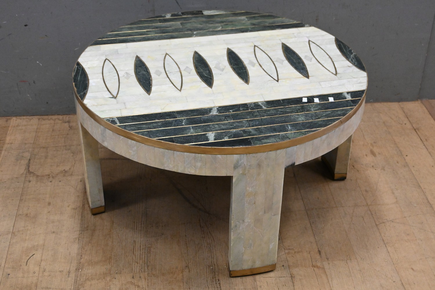 A DECORATIVELY INLAID STONE AND BRASS COFFEE TABLE (48H X 92D CM) (LEONARD JOEL DELIVERY SIZE: X-LARGE)