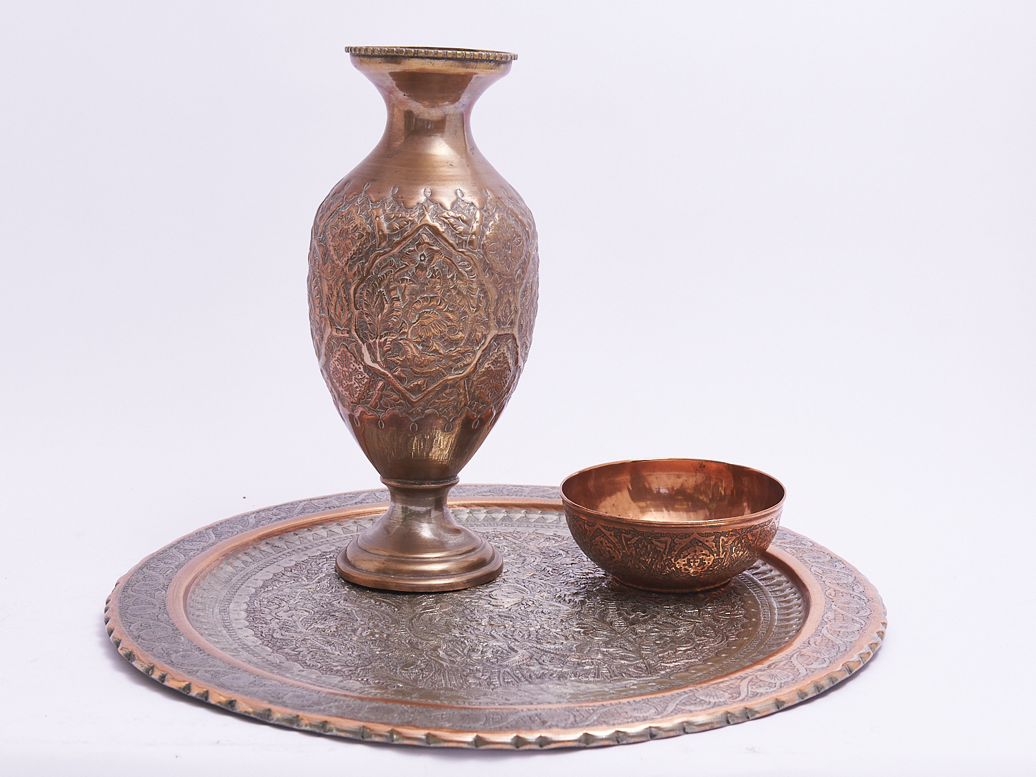 AN EMBOSSED COPPER TRAY, VASE AND BOWL DIA.49CM (LARGEST), LEONARD JOEL LOCAL DELIVERY: MEDIUM