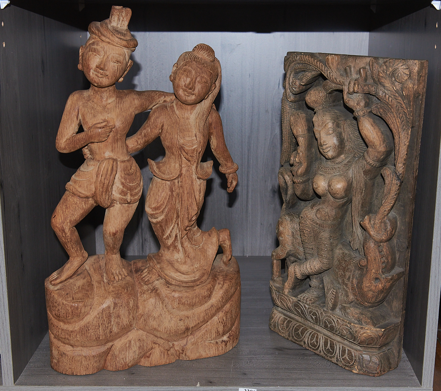 A CARVED WOOD DANCING FIGURE TOGETHER WITH ANOTHER, LEONARD JOEL LOCAL DELIVERY: MEDIUM