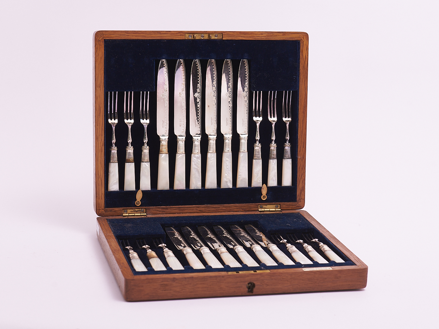 A MOTHER OF PEARL HANDLED FRUIT CUTLERY SET, HARDY BROS, CASED, LEONARD JOEL LOCAL DELIVERY: SMALL