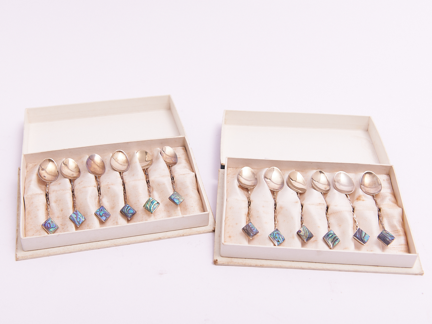 TWO SETS OF PAUA SHELL INSET STERLING SILVER COFFEE SPOONS, BOXED, LEONARD JOEL LOCAL DELIVERY: SMALL