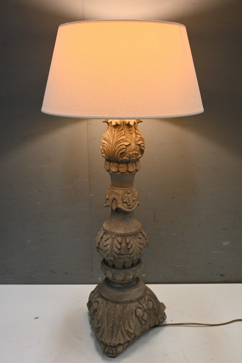 A CARVED TIMBER TABLE LAMP (88H CM) (LEONARD JOEL DELIVERY SIZE: MEDIUM)