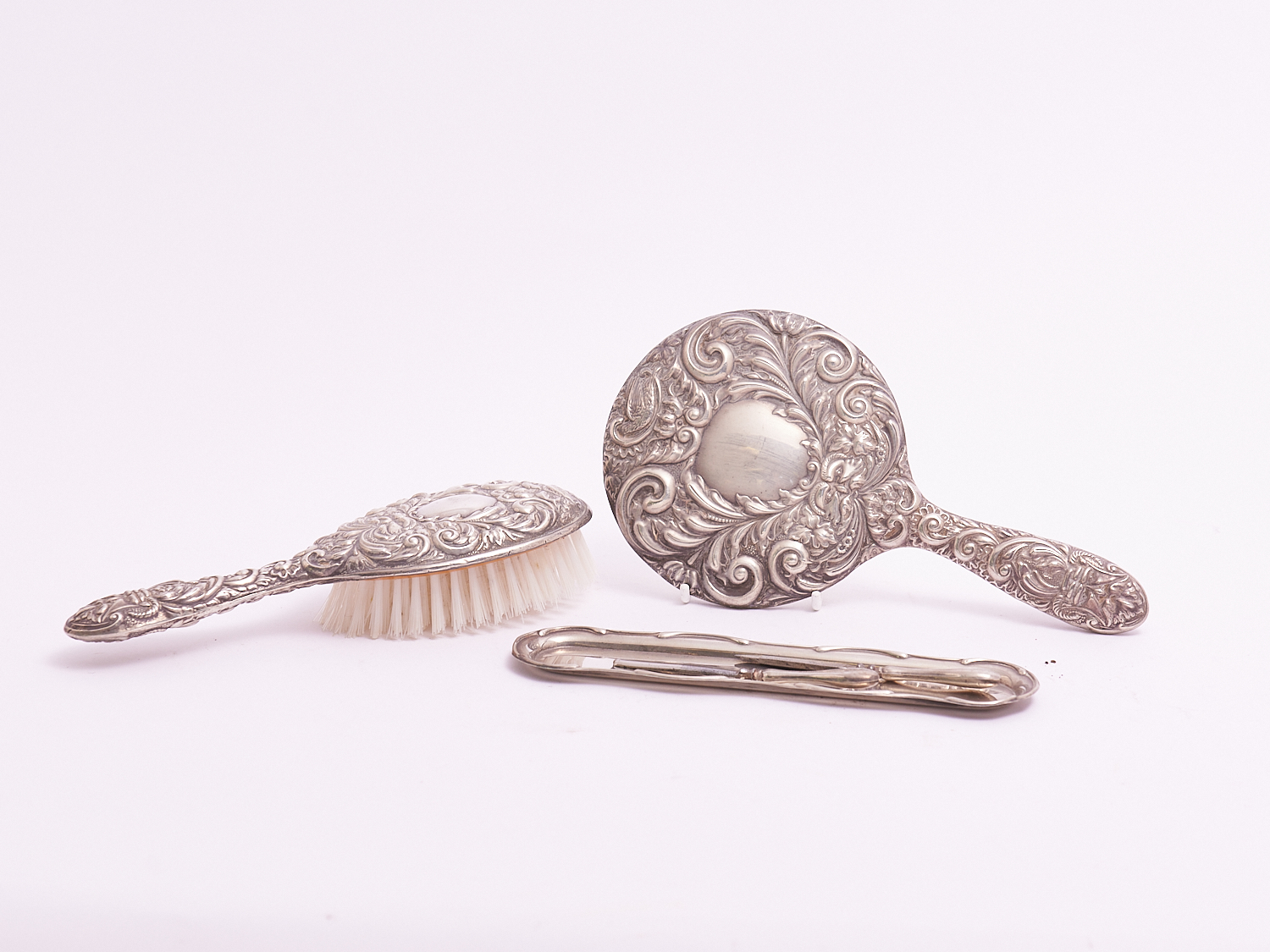 A GROUP OF STERLING SILVER VANITY ITEMS INCLUDING MIRROR, BRUSH, ETC, LEONARD JOEL LOCAL DELIVERY: SMALL