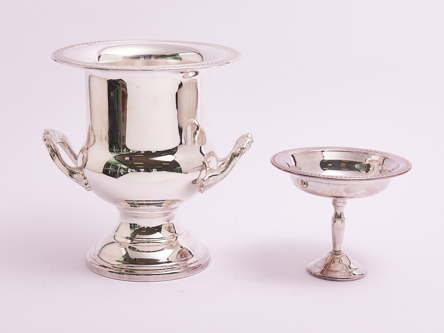 A RALEIGH SILVER PLATE ICE BUCKET TOGHETHER WITH SILVER PLATE COMPORT, LEONARD JOEL LOCAL DELIVERY: MEDIUM
