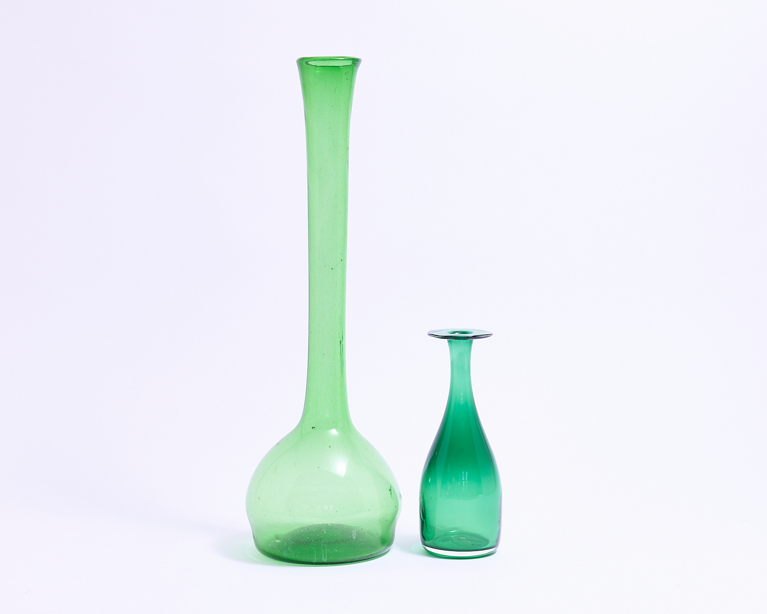 A PAIR OF HANDBLOWN GREEN GLASS VASES, ONE SIGNED H.45CM (TALLEST), LEONARD JOEL LOCAL DELIVERY: MEDIUM