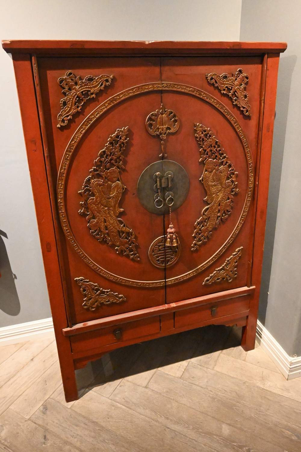 A LARGE CHINESE RED LACQUERED CABINET (A/F) (175H X 120W X 51D CM) (PLEASE NOTE THIS HEAVY ITEM MUST BE REMOVED BY CLIENTS OR CARRIERS AT THE CUSTOMERS EXPENSE. LEONARD JOEL STAFF CANNOT ASSIST CARRYING THIS ITEM)
