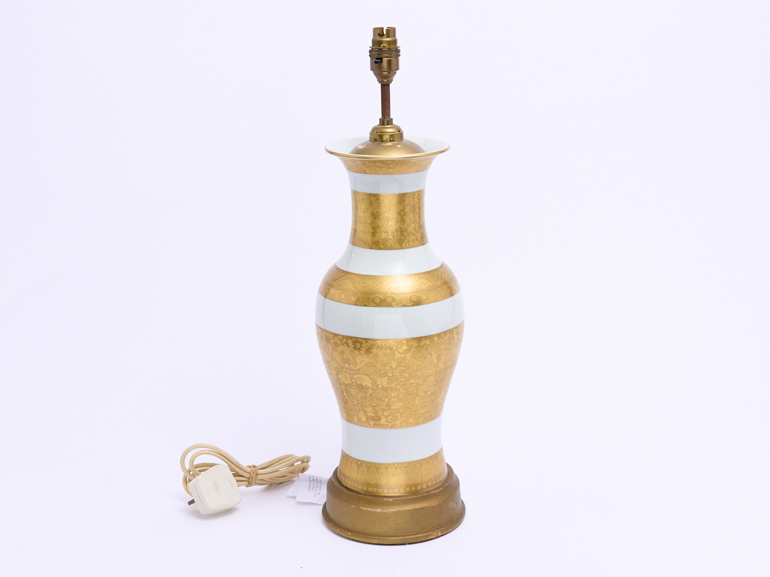 A GILT DECORATED GLAZED CERAMIC LAMP BASE ON WOODEN BASE, LEONARD JOEL LOCAL DELIVERY: MEDIUM