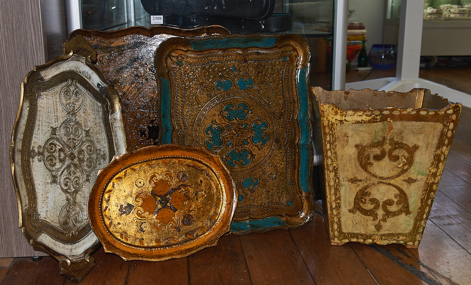 A COLLECTION OF ITALIAN FLORENTINE WOODEN TRAYS AND MATCHED WASTE PAPER BASKET, LEONARD JOEL LOCAL DELIVERY: MEDIUM