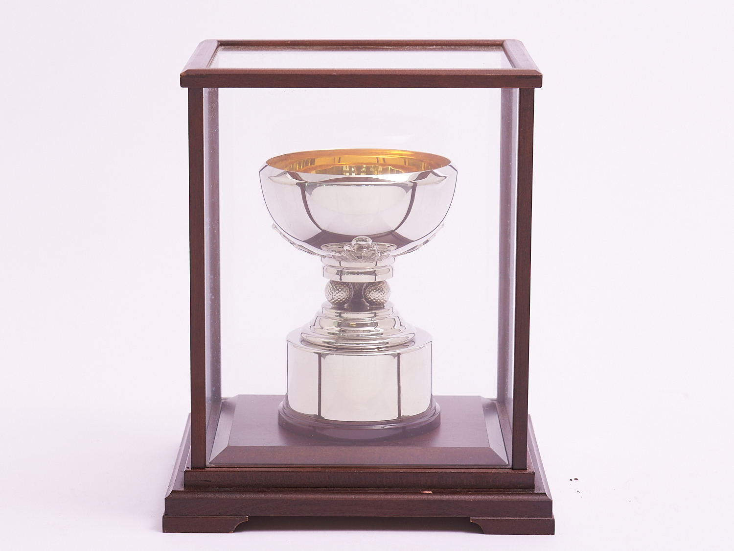 A SILVER PLATED GOLF TROPHY UNDER DISPLAY CASE, LEONARD JOEL LOCAL DELIVERY: MEDIUM