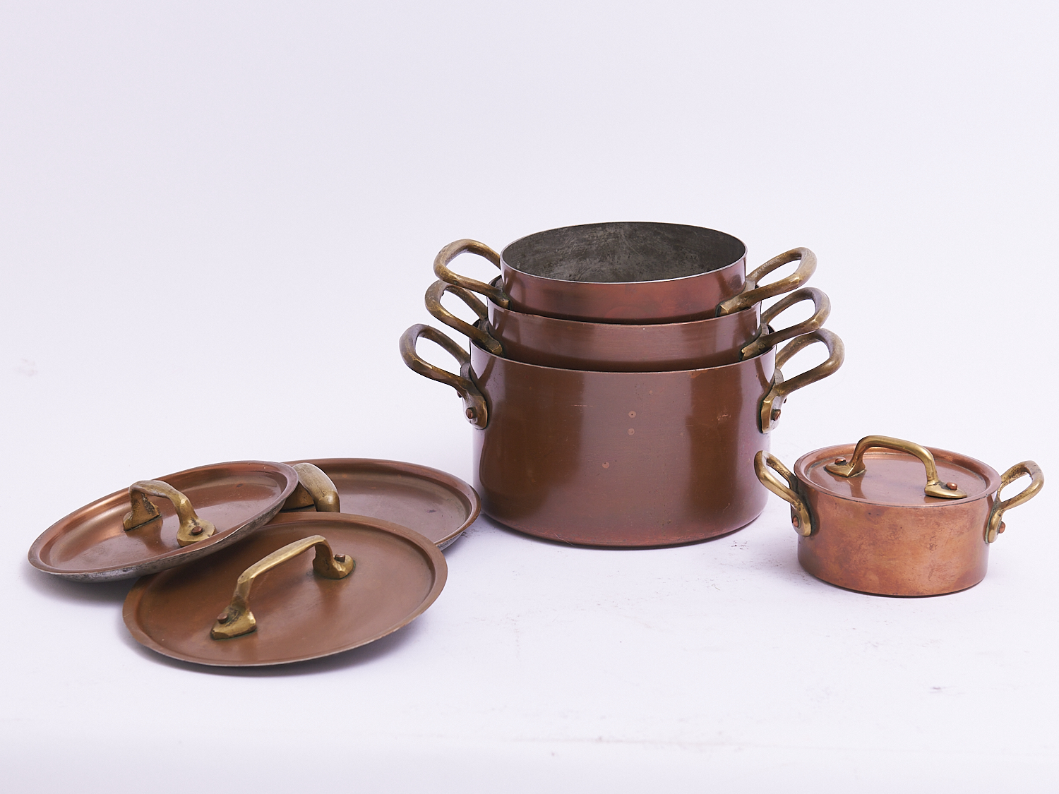 FOUR EARLY 20TH CENTURY FRENCH SOLID COPPER BRASS HANDLED LIDDED SAUCEPANS / COOKING POTS, LEONARD JOEL LOCAL DELIVERY: MEDIUM