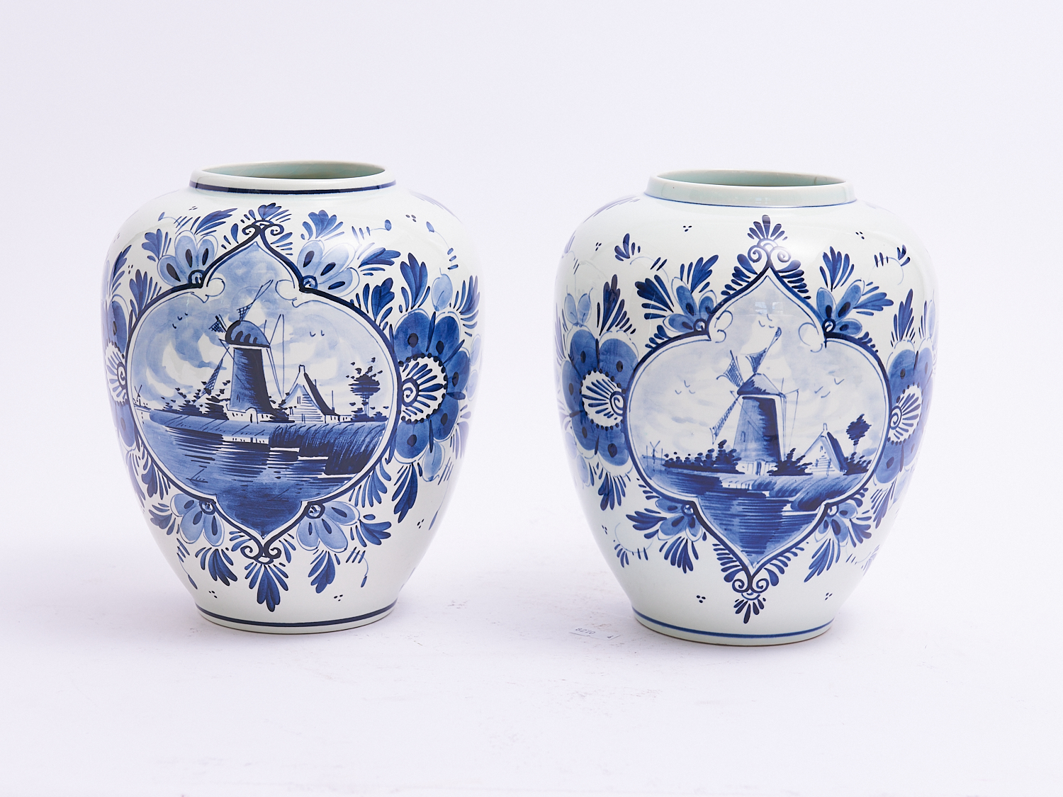 A PAIR OF EARLY 20TH CENTURY DUTCH DELFT BLUE AND WHITE WINDMILL SCENE BULBOUS VASES H.21CM, LEONARD JOEL LOCAL DELIVERY: MEDIUM