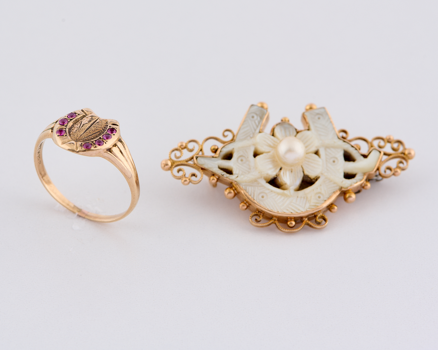 A VICTORIAN MOTHER-OF-PEARL BROOCH WITH SETTING IN 14CT GOLD, 8.9GMS, ALONG WITH A PINK SAPPHIRE SET HORSESHOE RING IN 9CT GOLD, SIZE S, 3.0GMS
