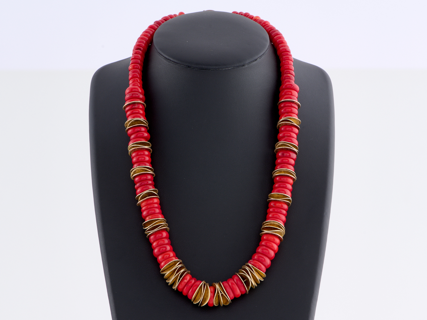 A CORAL BEAD NECKLACE WITH GOLD PLATED SPACERS TO A LOBSTER CLASP, LENGTH 550MM