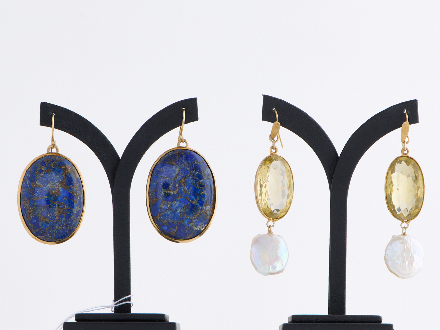 TWO PAIRS OF GEMSTONE EARRINGS IN GOLD PLATE, TO SHEPHERDS HOOK FITTINGS, DROP LENGTHS APPROXIMATELY 70MM AND 60MM
