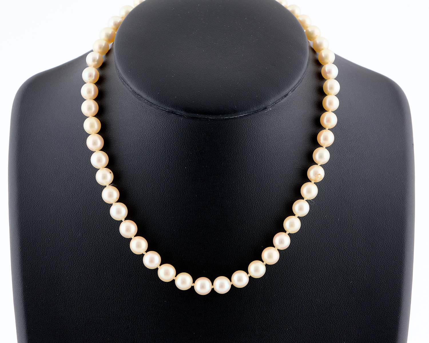 A STRAND OF FRESHWATER PEARLS TO A SILVER CLASP, THE PEARL DIAMETER APPROXIMATELY 7MM, LENGTH 380MM